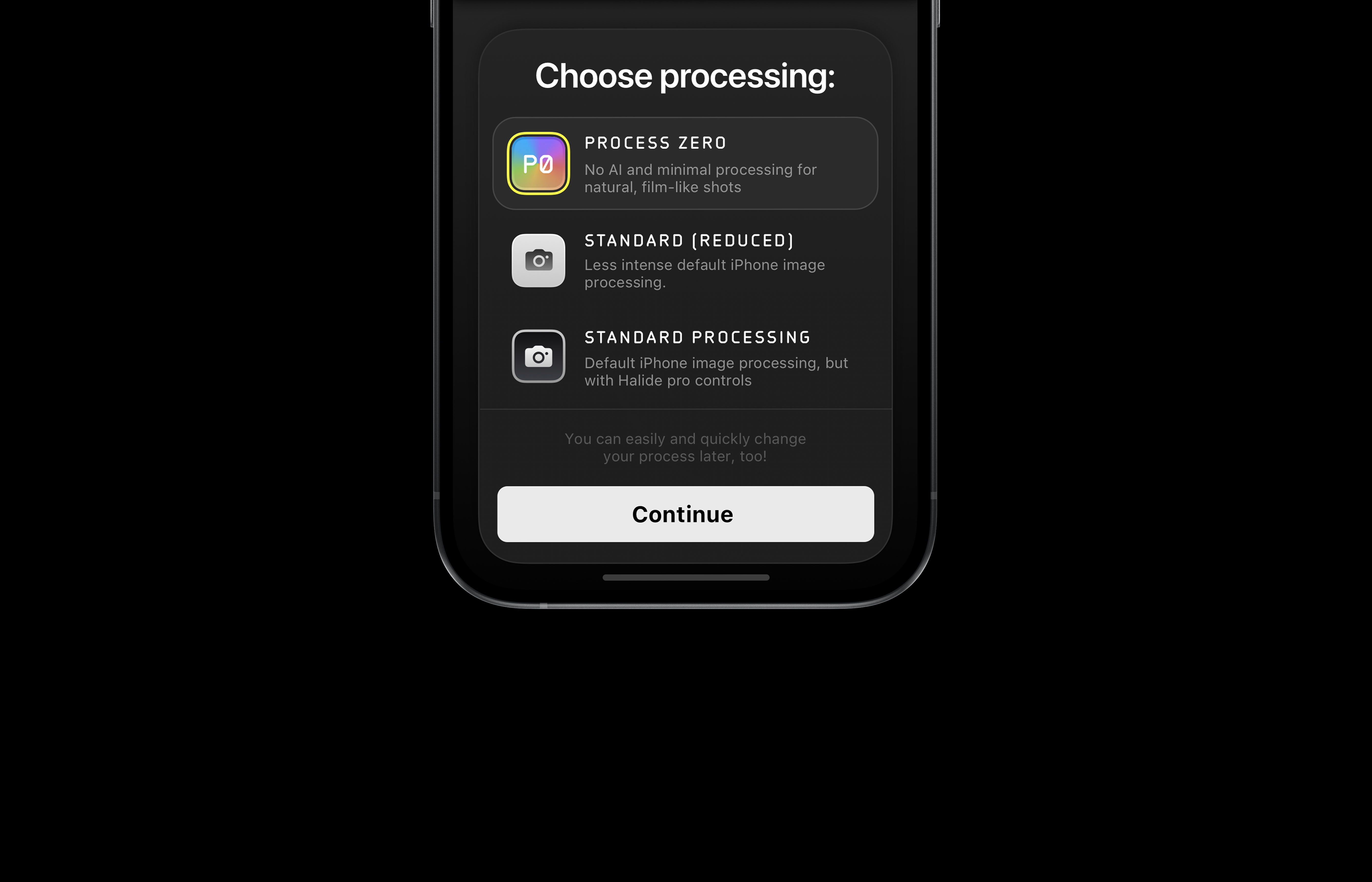 It starts with choosing a process. Out of the box, Halide lets you pick from 3 processing options. Processing is what your iPhone does to make your final photo. When you take a photo, iPhones typically combine many images into one to get a nicer looking shot.